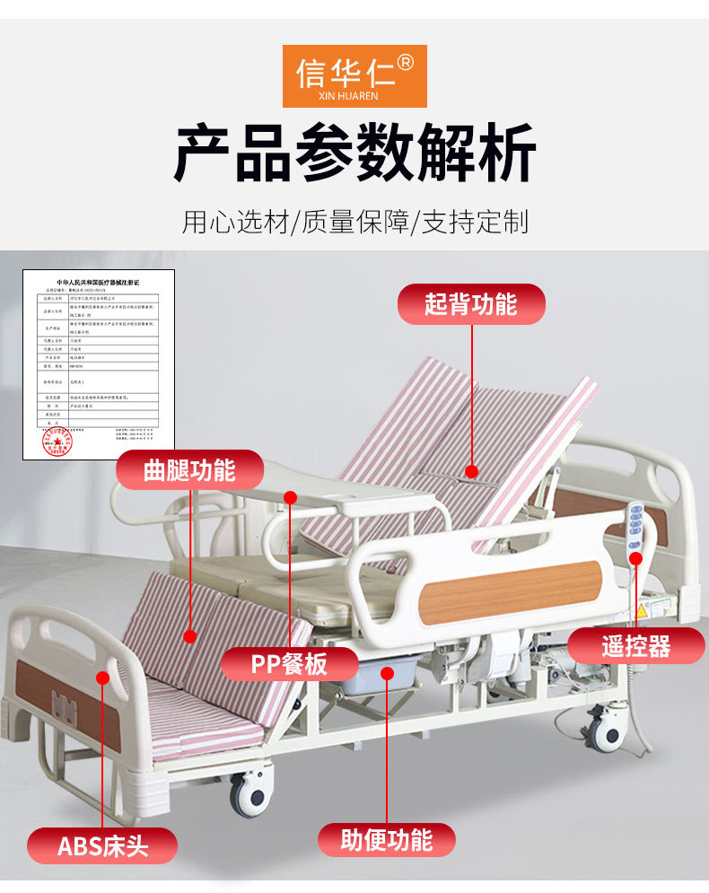 標準配置:ABS床頭1副;PP護欄一副;靜音輪4個;輸液架1支;